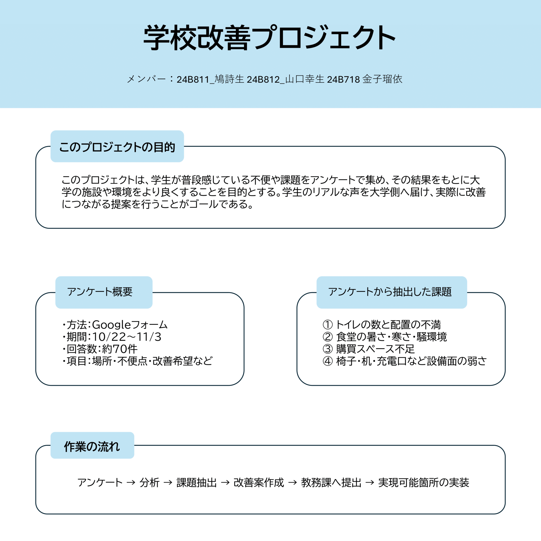 本プロジェクトの目的は、学校の設備をより良く整え、学生が快適で安心して過ごせる環境づくりに役立てることです。そのために、学生のみなさんに協力していただき、学校設備に関する不満や「こうなったらいいな」という意見をアンケートで集めます。調査では、教室の使いやすさや備品の状態、安全面、清掃や照明など、日常の学校生活で気になるさまざまな項目を取り上げます。集めた回答は丁寧に集計・分析し、改善が必要なポイントや優先度を整理します。そして、分析結果や提案を教務課に提出し、実際の設備改善につなげていきます。これにより、学生自身の意見が学校運営に反映され、より良い学校生活を送れる環境づくりに貢献することを目指します。また、アンケートの作成から分析、提案までの過程を通して、問題解決能力や発信力を高める学びの機会にもなります。