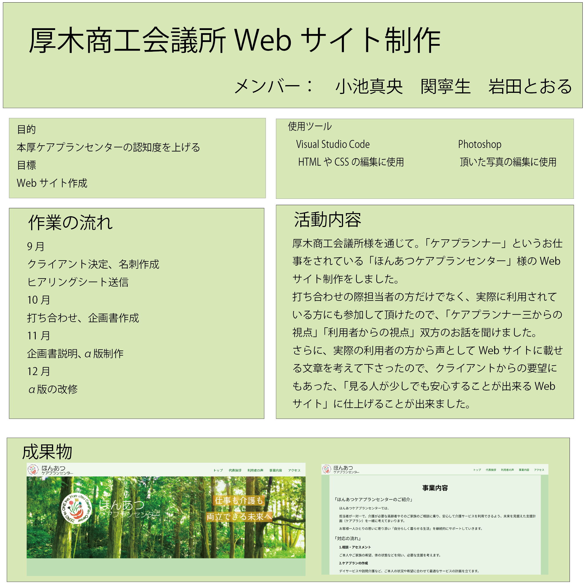 本プロジェクトでは、ほんあつケアプランセンターのウェブサイト制作を行いました。 ケアマネージャーや施設の役割が分かりやすく伝わり、利用を検討している方やそのご家族が安心して情報を得られることを目的としています。トップページには、「ほんあつケアプランセンター」という施設名と、「仕事も介護も両立出来る未来へ」というキャッチコピーを配置し、働きながら介護を行う方を支える施設であることが一目で伝わる構成にしました。 サイト内の主な内容として、•代表挨拶•利用者の声•事業内容•アクセス、を掲載し、施設の想いや信頼性、サービス内容が分かりやすく伝わるように構成しています。制作にあたっては、打ち合わせを2回行い、その後はメールでのやり取りを通して内容の確認や修正を重ねながら進めました。実際のやり取りを想定し、要望を反映させながら制作することで、より実践的なウェブサイト制作を意識しました。