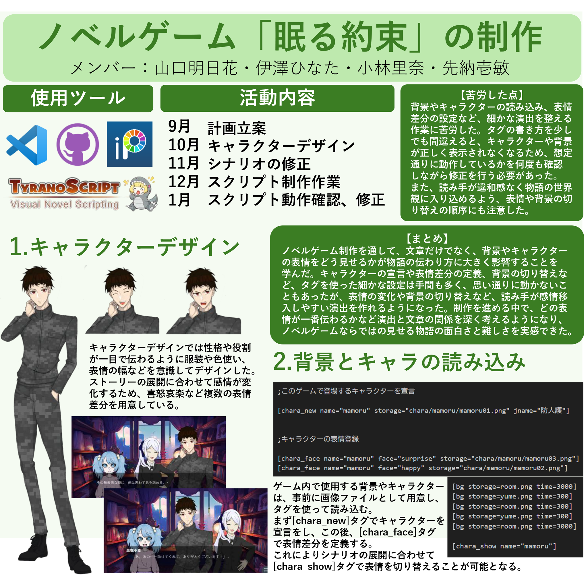 私たちは株式会社エッジワークス様との産学連携プロジェクトとしてノベルゲームを制作しました。 前期に制作されたシナリオをノベルゲームとして実装し、場面に合わせてキャラの登場・退場、会話文・表情の指定、背景などの画面遷移、BGM、効果音を設定しました。 主にVS code・ティラノスクリプト・ティラノスタジオを使用して制作しました。GitHubでデータを共有し、動作確認を行いながら制作を進めました。 イラスト制作では、登場キャラクターの線画、塗り、シーンによって変わる表情を作成しました。 表情の差分は4種類作成することで、よりストーリーにリアリティがでるようにしました。また、タイトル画面などのUIデザイン、ゲームアイコン等も作成しました。 主にアイビスペイントなどのイラストアプリと、Illustratorなどを用いて制作しました。